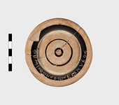 | Description: | Skyphos base found in two pieces. Broken at edge. Black glaze. Inscription scratched on yellow clay of base and also on inside of rim. | |