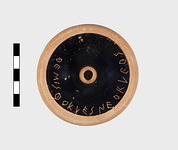 | Description: | Kylix base with part of stem. Black glaze. Inscribed on bottom. | |