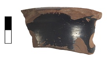 | Description: | Part of rim of heavy vase. Running scroll on top. Black glaze on outside. | |