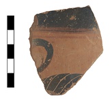 | Description: | Sherd of yellow clay with black band, fine red line and part of animal below. | |