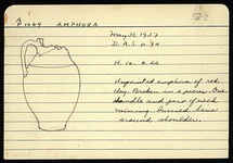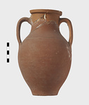 | Description: | Broken in two pieces. One handle and part of neck missing. Unpainted amphora of red clay. Incised line around shoulder. | |