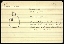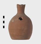 | Description: | Unpainted jug of red clay, part of neck broken. On one side a hole 0.016 diameter. On other side smaller hole. | |