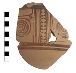| Description: | Broken in two pieces. Bands, parallel lines, scallops and spirals in brown on buff. ADDENDA 2017: 1 joining rim body sherd (mended from two pieces). From Lot 478, Layer VI A (Depth 7-9.30m). 2 non-joining body sherds (fragments b and c), Layer II (Depth 3-5m). ADDENDA 2018: Eight sherds mended into three sections to a large deep bowl with a flaring rim and low ring base. The exterior decoration includes a medium rim band, two narrow bands running below the handle zone, and two narrow bands placed at the junction of the bowl and the ring base. In the handle zone, the decoration is panelled with a central triglyph with inverted joining semi-circle fill flanked by antithetic spirals with a chevron fill. The interior is monochrome with a narrow reserved band at the lip. The paint is thick and uniformly applied. The firing is uneven, ranging from light to dark brown. There are no clear traces of use-wear or burning as preserved. Furumark Shape: 285; Furumark Motif 1: 75; Furumark Motif 2: 42; Furumark Motif 3: 50; Furumark Motif 4: 58 | |