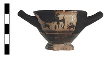 | Description: | Fragments of cup. Black glaze inside. Black and red bands outside. Black decorations on white ground on rim between handles. | |