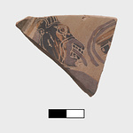 Description:   A lion's head; purple paint, edge of rim. Black interior glaze.