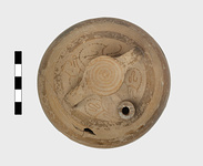 | Description: | Small Bugelkanne; buff clay with encircling lines in bands and some design on shoulder of vase. Pot 2. | |