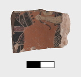 | Description: | Flat sherd. Woman with bow; painted dress, white arms. Other figure (?) purple decoration. | |