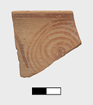 | Description: | Rose clay, unglazed buff surface with spiral decoration in red; portion of rim preserved. | |