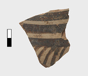 | Description: | Red clay, smooth buff surafce with pattern in black; late helladic III. | |