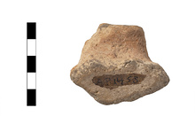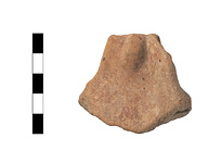 | Description: | Coarse gray clay, rough pink surface, small round knob, portion of edge of vase preserved. | |