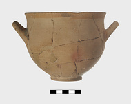 Description:   Jar with two handles, buff clay with brownish band about rim and base of handles and red paint on inside.