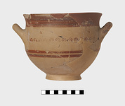 | Description: | Mycenaean skyphos; foot and other parts missing. Interior painted with a dark slip, in places fired red. Exterior wide red band about mouth. Below on a level with the handle joins a concentric row of double half circles. Below this, and the handles a second concentric band, with a reserved line in the center. Buff clay. ADDENDA 2018: Large deep bowl with flaring rim and two horizontal, round-section handles (one completely preserved). The decoration on the exterior consists of Group B banding: a wide rim band (0.035 m) and two medium bands below the handles. The handles are decorated with a single splash at the apex. In the handle zone there is a continuous row of isolated semicircles. The interior is monochrome. Paint streaky, but evenly fired brown. An interesting use-wear is seen on the interior consisting of fine parallel scratches, most intense on the lower-interior. Furumark Shape: 284; Furumark Motif 1: 43 | |