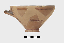 Description:   Fragmentary Mycenaean bowl with ONE horizontal handle, low foot, incurving rim.