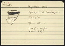| Description: | Rim of skyphos. Brown on buff. ADDENDA 2018: Seven sherds mended into two non-joining sections to a small deep bowl with flaring rim and part of a single horizontal, round-section handle. The exterior decoration consists of stemmed bowl banding and a medium band running below the handle zone. In the handle zone there are three wavy lines. The handle is tri-splashed. The interior has a medium band at the lip, but is otherwise undecorated. The paint is thick, but unevenly applied, resulting in a fired colour from pale to dark brown. There are no traces of use-wear or burning. ADDENDA 2020: Ten sherds (1 fresh break) mended into one large fragment and five non-joining sherds to a small deep bowl with flaring rim two, horizontal round handles, a conical lower bowl, and a short stem with domed foot. The exterior decoration consists of stemmed bowl banding at the rim, a medium band below the handle zone, two medium bands at the junction of the bowl and stem, and two narrow bands on the foot. In the handle zone there are three wavy lines. The handles are tri-splashed. The interior has a medium band at the lip and at the bottom of the bowl. The paint is thick, but unevenly applied, resulting in a fired colour from pale to dark brown. There are no traces of use-wear or burning. Very fine soft buff fabric with occasional small to medium orange or reddish-brown subangular rock fragments, irregular voids, and silver mica. Furumark Shape: 284; Furumark Motif 1: 53 | |