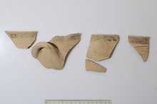 | Description: | Rim of skyphos. Traces of orange on buff. ADDENDA 29 November 2017: One rim fragment with handle. From Lot 478, Layer VII A (depth 6-9.30m) Two non-joining rim sherds (fragments c and d). From Lot 478 : c) Layer W-A (depth 2-8m) d) Layer I (depth 0-3m) ADDENDA 2018: Five sherds mended into two fragments of a large deep bowl with flaring rim with a horizontal, round-section handle. The exterior decoration consists of a medium band at the rim and a panelled handle zone with central triglyph flanked by antithetic spirals with chevron fill. The handle is tri-splashed. The interior is monochrome with a medium reserved band on the rim. The paint looks evenly applied, but is badly flaked. Originally fired dark brown. There are possible traces of use-wear, but little of original surface survives. No signs of burning are present. Furumark Shape: 285; Furumark Motif 1: 75; Furumark Motif 2: 50; Furumark Motif 3: 58 | |