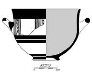 | Description: | Side of skyphos with handle. Orange on buff. ADDENDA 29 November 2017: One handle, one base and two body sherds (fragments c, d, e, f) from Lot 478, layer VII C (depth 9-10m). One body sherd (fragment g) from Lot 569, layer XII A (depth 15-18m) One body sherd (fragment h) from Lot 568, layer XII B (depth 15-18m) ADDENDA 2018: Twelve sherds mended into four sections: Frag. a= fragments originally numbered a and b now joined from 7 pieces; Frag. b and c = joining but not mended from two pieces found in 2017; Frag.d mended from two pieces and Frag. e, a single fragment. Medium deep bowl with flaring rim and two horizontal, round-section handles. The exterior decoration includes a medium rim-band, two medium bands running below the handles, and an additional two medium bands at the foot. In the handle zone the decoration is panelled, consisting of a central triglyph with chevron fill and joining semi-circle fringe, flanked on either side by triglyphs with chevron fill, but no fringe. The handles are tri-splashed. The interior is monochrome with a reserved circle at the bottom of the bowl (likely intentional). The paint is uniformly applied and fired fairly evenly pale orange. There are no obvious traces of use-wear (although the vessel is fairly worn). Clear burn smudges are found on the interior of the vase. Furumark Shape: 284; Furumark Motif 1: 75; Furumark Motif 2: 58; Furumark Motif 3: 42 | |