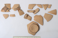 | Description: | From a skyphos. Brownish black on buff. ADDENDA 2018: Four sherds, mended into two, non-joining sections of a small deep bowl with flaring rim. No other features are preserved. The exterior decoration consists of a narrow lip-band and a fine line group running beneath the handles. In the handle zone, there is a single central lozenge with "pennons". The interior is decorated with a double lip-band. The paint is uniformly applied and evenly fired dark brown. There are no signs of use-wear or burning. ADDENDA 2020: Fifteen sherds, mended into five fragments and four non-joining (two body, one handle, one rim) sherds from a small deep bowl with flaring rim, a partially-preserved horizontal round handle, and a raised concave base. The exterior decoration consists of a narrow lip-band and a fine line group running beneath the handles, and a band on the exterior of the base. In the handle zone, on each side, there is a single centrally-placed lozenge with "pennons". The handles are tri-splashed. The interior is decorated with a double lip-band, and a medium band at the bottom of the bowl. The paint is uniformly applied and evenly fired light to dark brown. There are no signs of use-wear or burning. Wear on the interior occurs along the break edges and is presumably depositional. ADDENDA June 2022: 16 sherds total: one sherd added to frag. a, seven new added frags., c and e mended from two sherds, d from 3 sherds, the others four (f,g,h,i) are single fragments. Buff fabric with small sub-angular white rock fragments, and pale yellow to brown sub-rounded sedimentary rock fragments, small to medium irregular voids, and fine silver mica. Furumark Shape: 284; Furumark Motif 1: 73 | |