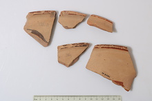 | Description: | Rim fragment from ball shaped bowl with flat rim projecting in ward and flat base. Brownish black paint with red streaks on pinkish buff. ADDENDA 2018: Five fragments mended into three non-joining sections of a large-sized kalathos with rounded rim. One fragment preserves part of a horizontal handle attachment. The decoration is linear on the exterior and interior. The exterior has a narrow lip-band and two narrow bands running below the handle. The interior features a solid band covering the upper surface of the rim and continuing into the interior of the bowl with a second medium band running below it. The handle preserves at least one splash and was probably tri-splashed. The paint is fairly evenly applied, although there is some streakiness. The firing is somewhat uneven ranging from red to dark brown. There are no trace of use-wear or burning. Furumark Shape: 291 ADDENDA 2021 (AE): One fragment (now AP 2781b), mended from three pieces, and one non-joining rim fragment (now AP 2781c) added in 2018 from lot 483. | |
