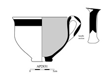 | Description: | Rim and handle of shallow bowl of tea cup shape. Orange red on buff ground. ADDENDA 2018: Frag. a: five sherds mended into one large fragment joined to original single piece and three non-joining fragments (frags. b - d). Large semi-globular cup with a flaring rim, vertical, rectangular-section handle and raised base. The exterior decoration consists of a narrow lip band with a medium band running below the rim (and under the handle). The upper part of the handle is painted with a single splash of paint. The lower body and foot are reserved. The interior is monochrome. The paint is thick, with regular streaks, fired red. There are no traces of use-wear or burning. Some sort of residue splattered on interior of vessel. Furumark Shape: 215 | |