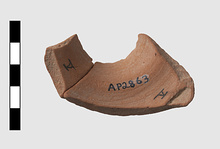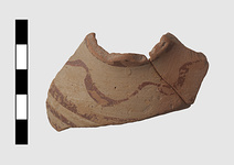 | Description: | Fragment from squat jar with flaring rim, two or three handles on shoulder. Red paint on buff ground - wavy line on shoulder. ADDENDA 2018: Two sherds mended into a single fragment of a small closed shape with no preserved features. The exterior decoration consists of three narrow bands below the shoulder zone. The neck/rim is monochrome as preserved. In the shoulder zone there is a wavy line. The paint is thick and evenly applied, fired red. There are no traces of use-wear or burning. Furumark Motif 1: 53 | |