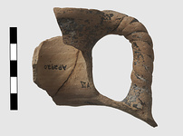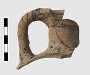| Description: | From a pitcher with a rope handle and slender neck. Black on pale buff. ADDENDA 2018: Two sherds mended into a single fragment from a small jug with flaring, slightly hollowed lip, and a single, vertical twisted handle. The exterior is monochrome. The interior has a narrow band running below the lip. The paint is thick, evenly applied, but badly flaked, fired black. There are no traces of use-wear or burning. Furumark Shape: 137 | |