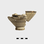 | Description: | Fifteen sherds mended into two fragments and three (b to e=4?) non-joining fragments of a cup with conical body, a lipless, incurving rim, a horizontal, round-section handle, and a high ring base. The exterior decoration consist of a medium lip-band, two narrow bands running below the handle zone, a narrow band above the junction of the bowl and the base, and a medium band on the exterior of the ring base. The upper surface of the handle is painted with a single splash of paint. The interior is monochrome with a medium reserved band on the interior of the rim. The paint is thick and somewhat unevenly fired red to dark brown. There are no obvious traces of use-wear or burning. Furumark Shape: 242 | |