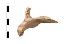 | Description: | Fragment of askos with part of a handle remaining. Around the body and on the handle are bands of brown paint. Above these are squares formed of chevrons in same color. | |