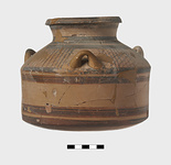 | Description: | Squat jar with three handles. Two restored. Buff clay with bands of brown paint and cross hatched pattern. | |