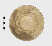 | Description: | Yellow glaze on inside with circular band of scroll pattern. | |