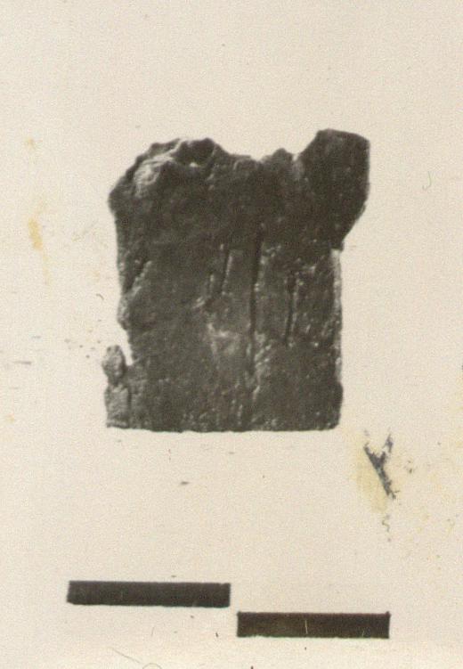 | Description: | Roughly square object. Heavily corroded on one side. One finished edge preserved. Scratched on the other side ΙΦ. | |