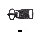 Description:   The buckle is intact except that the rivet which held the tongue to the main part of the buckle. Has snapped. On the clasp end of the buckle is a crudely engraved lion left, with tail in air. The tongue end is an ellipse; the clasp end a rectangle.