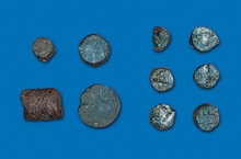 | Description: | Eleven pieces cut from a rod. One of these is the remnant of the rod, become to short for further cutting. Eight pieces are "normal", two are scraps. The cutting was done with a chisel anywhere from one to four blows to the cut (waste from making coins? Is poros building the mint - ΑΡΓΥΡΟΚΟΠΕΙΟΝ ?) | |