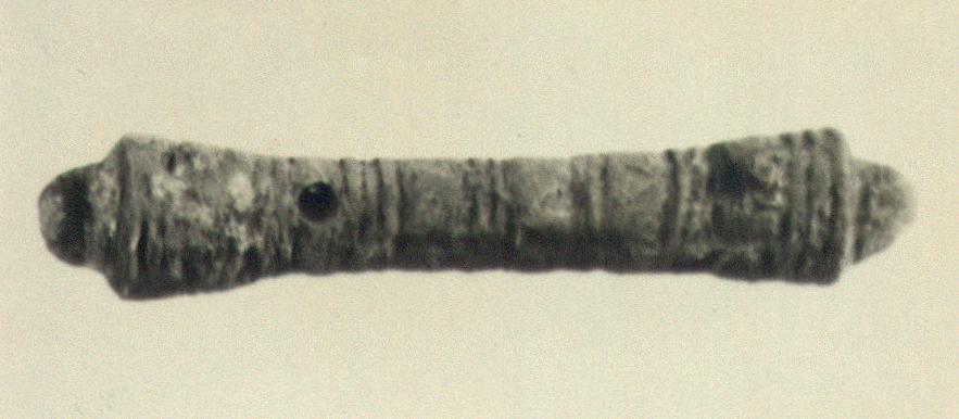 | Description: | Short rod. Diameter increasing towards the two ends, each finished with a small knob. Group of grooved lines around. A rivet in place near one end and a rivet-hole near the other. | |