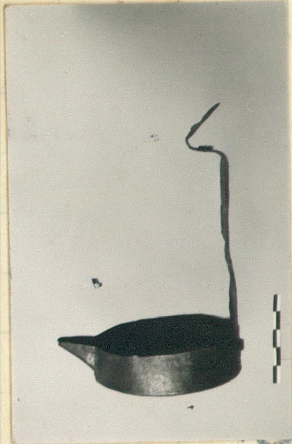 | Description: | Complete except for small fragments. Vertical wall; flat bottom; one open nozzle. Vertical strap handle rising from one side. | |