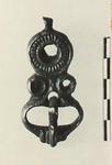| Description: | Intact. A heavy buckle composed of a circle decorated with vertical strokes and a plain oval with the tongue. Two small circles between the main elements. On the underside two holes for attachement. Buckle and plate cast together. | |