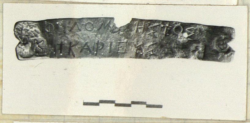| Description: | Intact with the inscription: ΦΙΛΟΜΝΗΣΤΟΣ ΙΚΑΡΙΕΥΣ. Ends curve forward due to heavier erasure in middle. Notches in each end apparently for fitting nails in workbench to hold plate firmly during erasure or inscribing. Seals: a) lower left, triobol seal (owl facing, surrounded by olive spray and ΑΘΗ; b) at right, gorgoneion. c) at lower right, double-bodied owl with tilted alpha in upper left and right corners. a) and b) stamped before pinakion originally inscribed. c) added sometime later. Section letters and number of uses: For last use: kappa in incuse square stamped at left. For next to last use: eta in incuse square at left of and under Kappa. Three prior uses: superimposed inscribed beta, kappa, gamma (?) in upper left corner. For original use: restore stamped section letter in upper left corner, no trace of which now visible. Hence a minimum of six uses. <graphic> | |