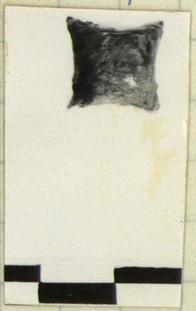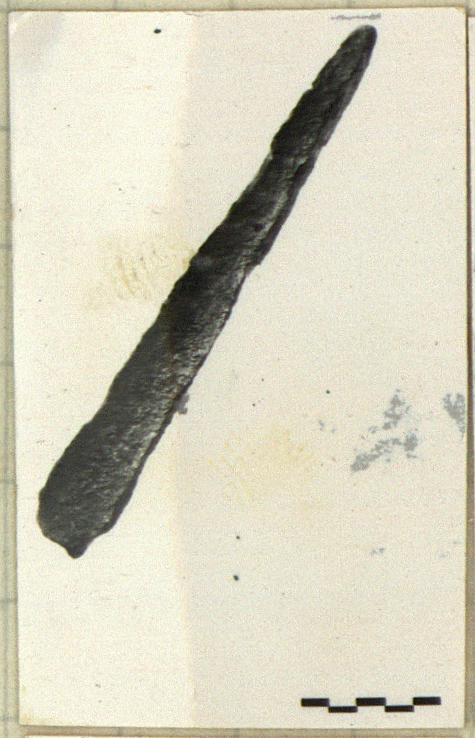 | Description: | Partly disintegrated on one side. Each of four sides concave, three are inscribed. Butt tapers at one end, hole for insertion of spear shaft on other. Bronze(?) | |