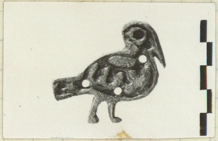 | Description: | Intact. Bridle attachment in the shape of a bird facing right. The eye is shown by a round relief circle. On the body the letters for Constans II. Three attachment holes, one at neck, one at tail and one at belly. Projection at back with one hole through it. Cf. B 96. | |