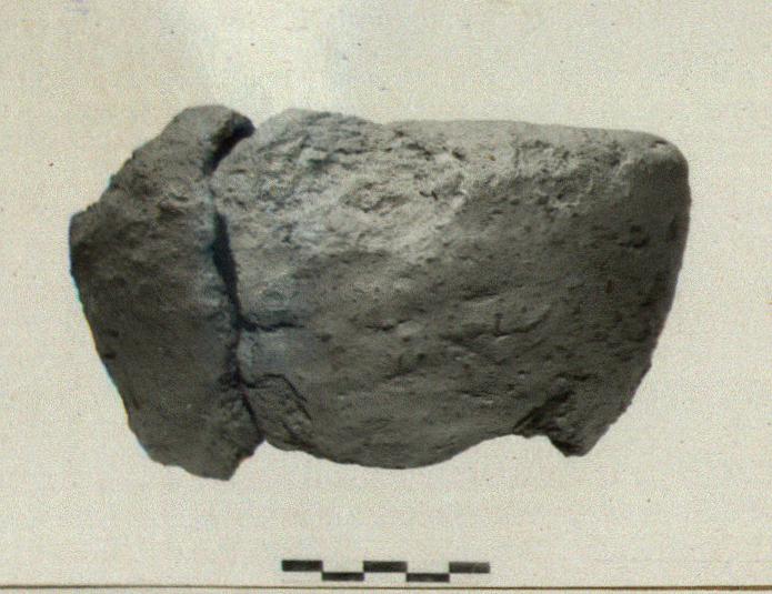 | Description: | Mended from two pieces preserving part of up and ovoid bowl. Coarse red clay around inner layer of gray clay, coated inside with fine red slip, blackened towards base of bowl. Cf. B 1446, similar type. | |