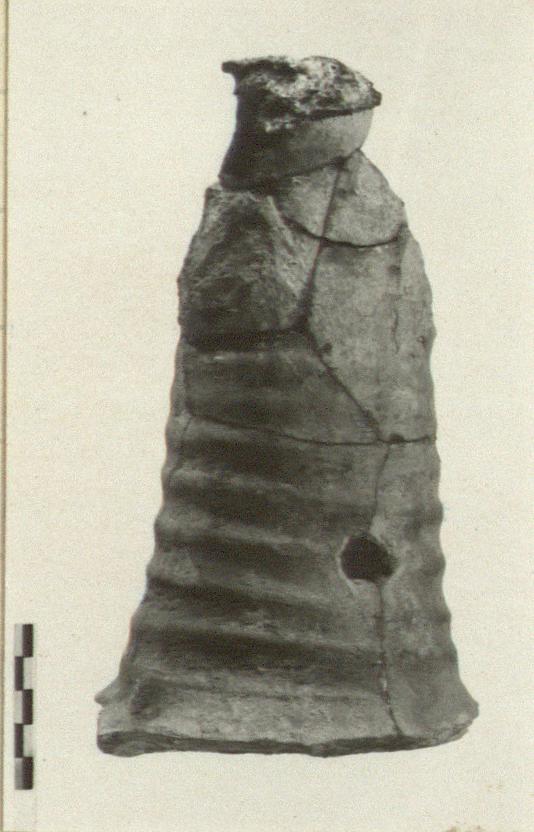 | Description: | Mended from 12 pieces. Preserves part of rim, neck and top of shoulder. Sloping shoulder, neck inclined inwards horizontal ridged, with small hole 1/3 away from shoulder; handles missing. Vertical rim sags from heavy black glassy vitrifications which speads and drips downward over part of neck. Red micaceous clay. Cf. B 1520 | |