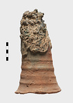 | Description: | Preserving most of slightly tapering amphora neck with hole near base of neck; upper 2/3 of neck coated with brown to black vitrified clay containing traces of bronze. Interior of base of neck blackened below hole. | |