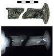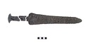 Description:   Broken in three fragments: at handle attachment and midway along hilt. Upper part of blade cracked. Three rivets preserved along hilt, two on widest area of blade. Seven complete studs (+one fragmentary) of which five have gold leaf wrapped around their rim are also preserved. On hilt two small fragments of gold leaf still attached.