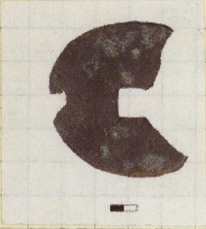 | Description: | Single fragment. Flat, oval copper alloy object with square hole cut in center. Preserves dark brown patina and pale blue corrosion. | |
