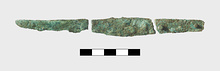 | Description: | Four joining fragments but only tip piece has been mended. Heavily corroded with incrustations. Thin blade narrowing at both ends. The blade tapers to a blunt point. Two rivets at opposite end for attachment to handle. Mycenaean LHIIIA. | |