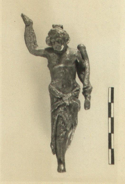 | Description: | The left foot is missing; the right arm is somewhat swollen and split from corrosion; otherwise complete. No base. The figurine represents a youth striding forward, the right leg advanced. The features are childish, framed by roughly executed curls. On the top of the head is a small rectangular projection. The figure is partly draped: a panther (?) skin is knotted around his hips. His right arm is upraised; in his left carries a slender cornucopia. | |