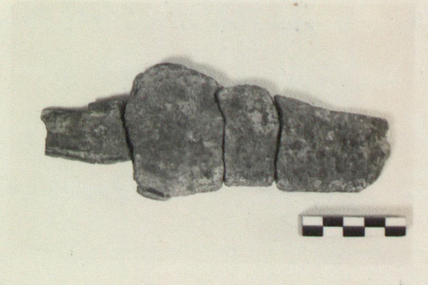 | Description: | Four joined fragments preserving part of the hilt and the stub of the blade. The edges of the hilt and of the shoulders of the blade are turned over to grip the material (probably wood) of the handle plates. Cf. P 5887 (fragment of Mycenaean goblet). | |