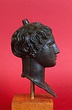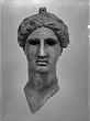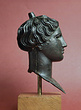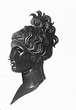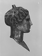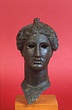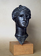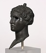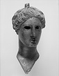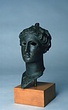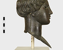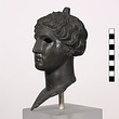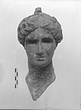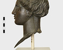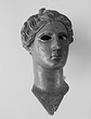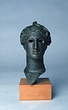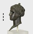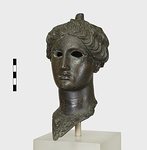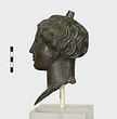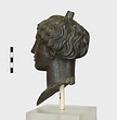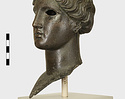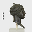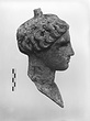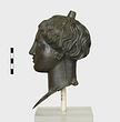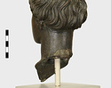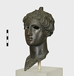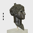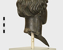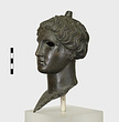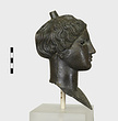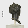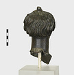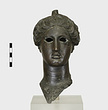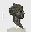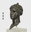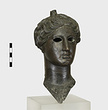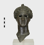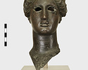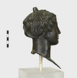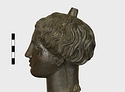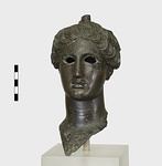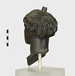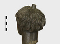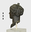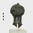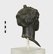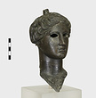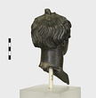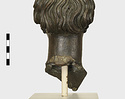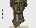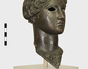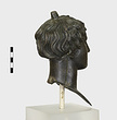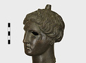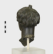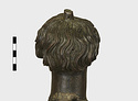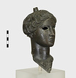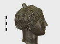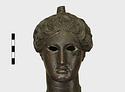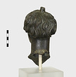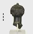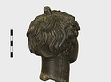 | Description: | Two thirds life size. Preserved intact save for eyeballs which probably were inset. Hair gathered up from all sides to a stout peg in middle of crown. Terminates in front below throat in a triangular projection of thin bronze; behind in three heavy lugs. | |