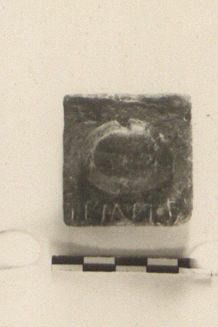 | Description: | Thick square slab of bronze. The metal having a high lead content. On the top added in relief, an oval shield. Inscribed on top lengthwise of the shield and around two vertical faces. | |