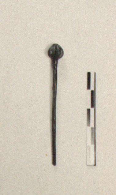 | Description: | Tip broken off; badly oxidized and could not be cleaned (disintegrated in the effort); otherwise intact. Plain straight shaft with two grooves just below the head. Large pointed knob-like head, ornamented with deep curving melon-grooves. | |