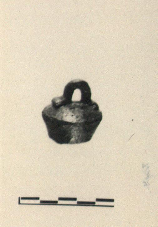 | Description: | Small circular weight, wider below than above. The top domed, and supplied with a loop-handle. | |